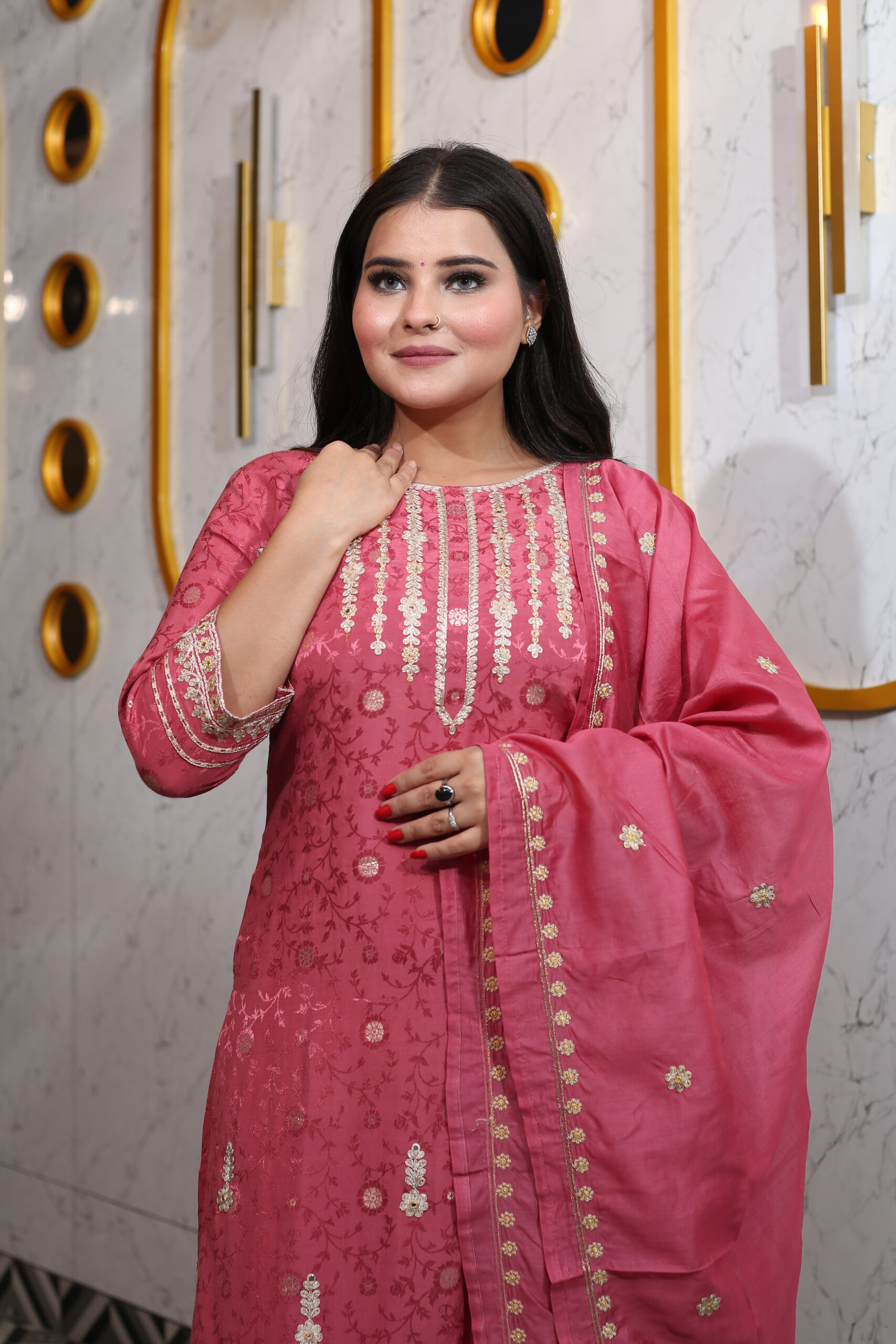 A Banarsi cotton silk Indian suit in a lovely pink shade, adorned with intricate handwork, would exude traditional charm and elegance. Consider incorporating delicate embroidery or embellishments on the suit, focusing on details like the neckline, sleeves, and hem. This combination of Banarsi fabric and handwork adds a touch of sophistication, making it a graceful choice for special occasions.