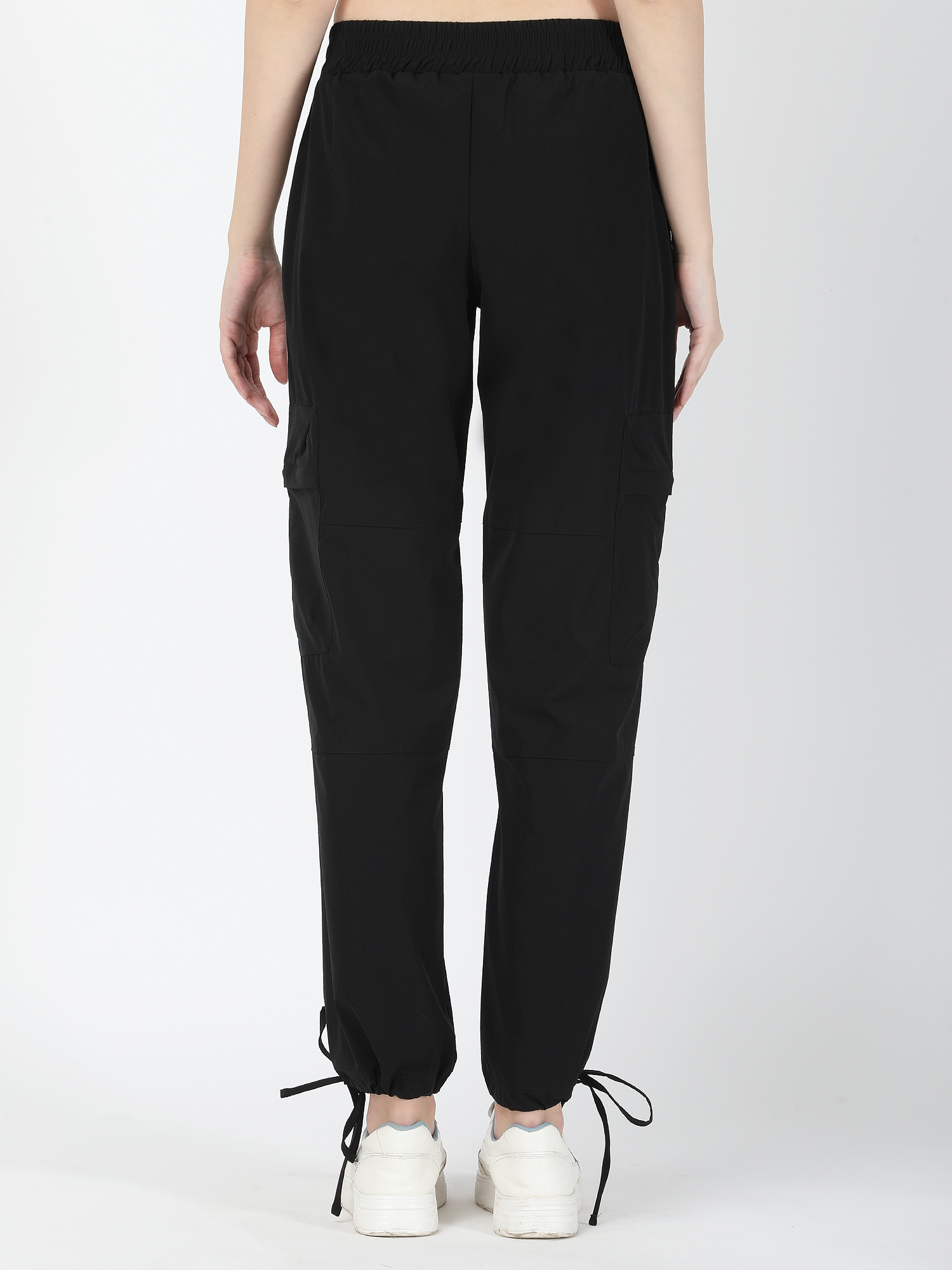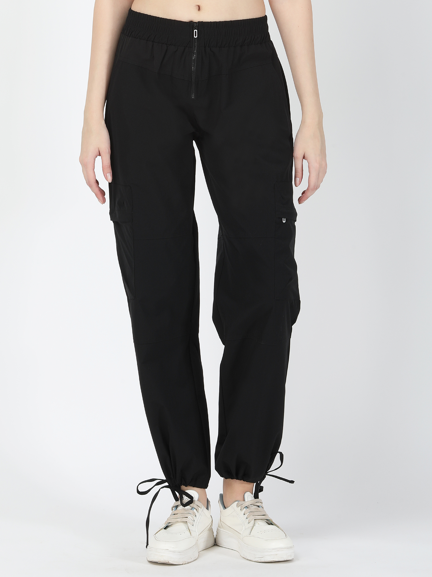 Enhance your casual style with these black parachute pants featuring a zipper on the waist. The side pockets add functionality, while the elastic drawstring and cord stopper at the hems provide a customizable fit, combining comfort and versatility in a sleek design.