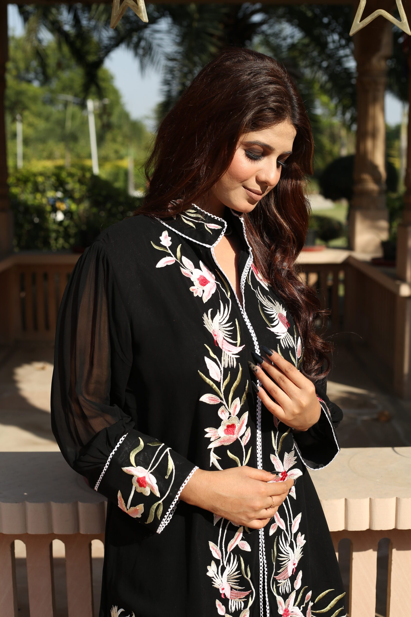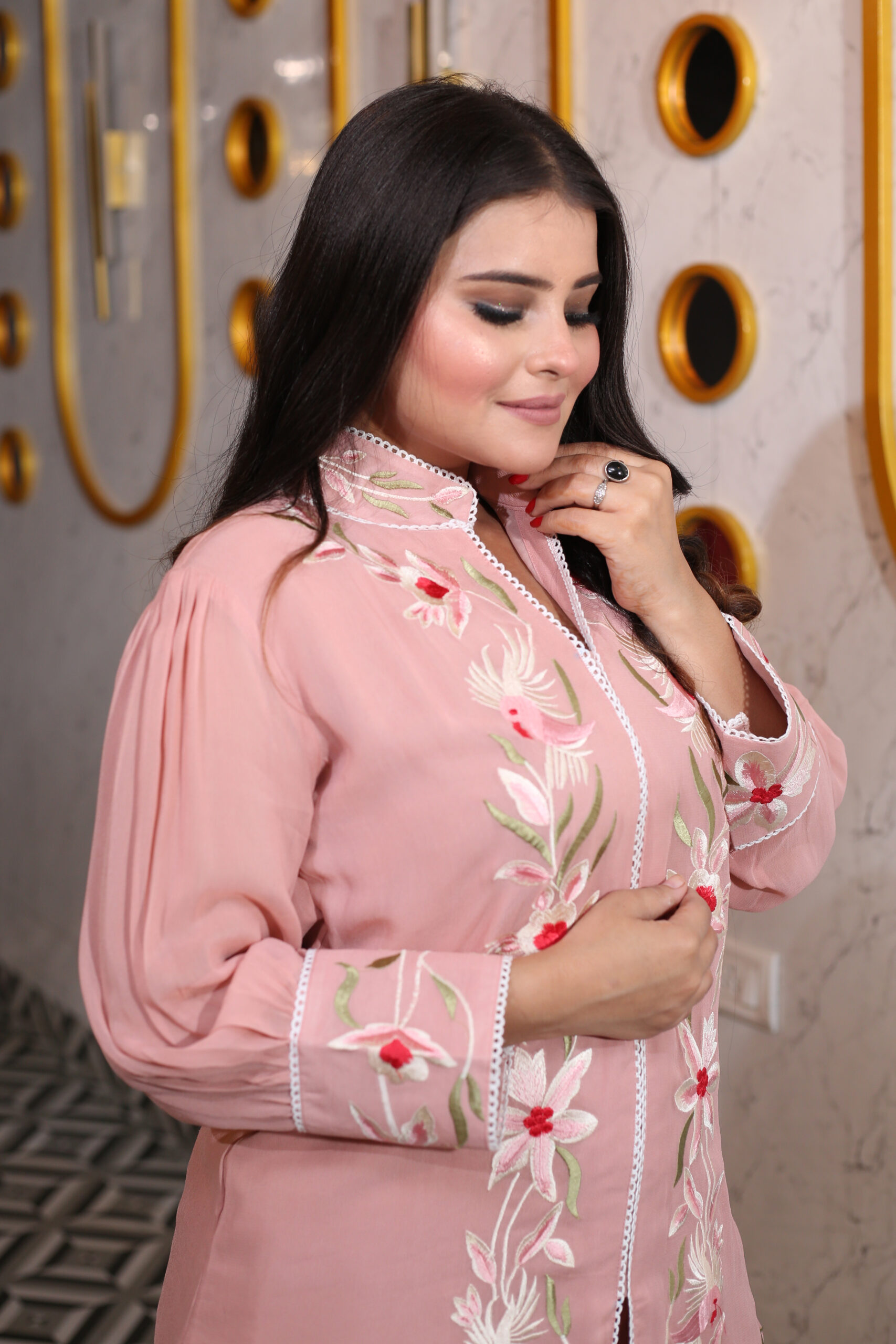 Indulge in refined elegance with our Pure Georgette Coord Set featuring a chic collar neck. Handwork thread embroidery graces the collar, handcuffs, and top, adding intricate detailing to this ensemble. The broad pant style provides a contemporary silhouette, while the lace detailing on the bottom adds a touch of sophistication. Crafted from luxurious pure georgette, this coordinated set seamlessly blends comfort with timeless style. Elevate your wardrobe with this meticulously designed Pure Georgette Coord Set, where every element, from the collar to the lace detailing, speaks to the artistry of fashion.