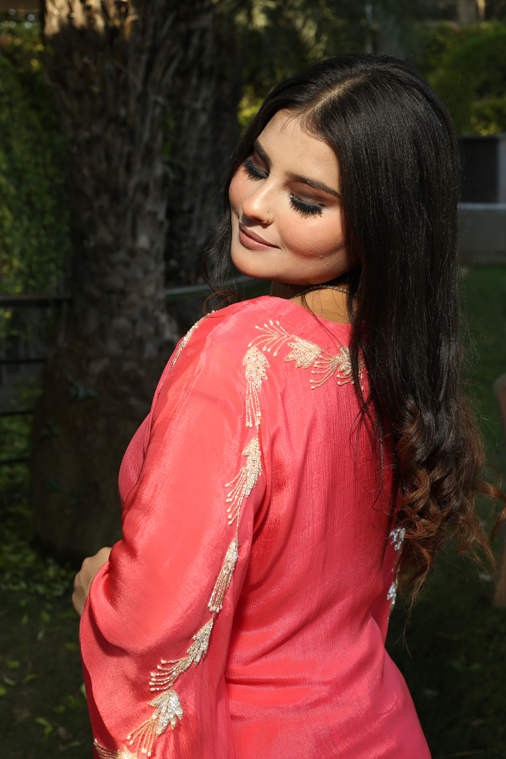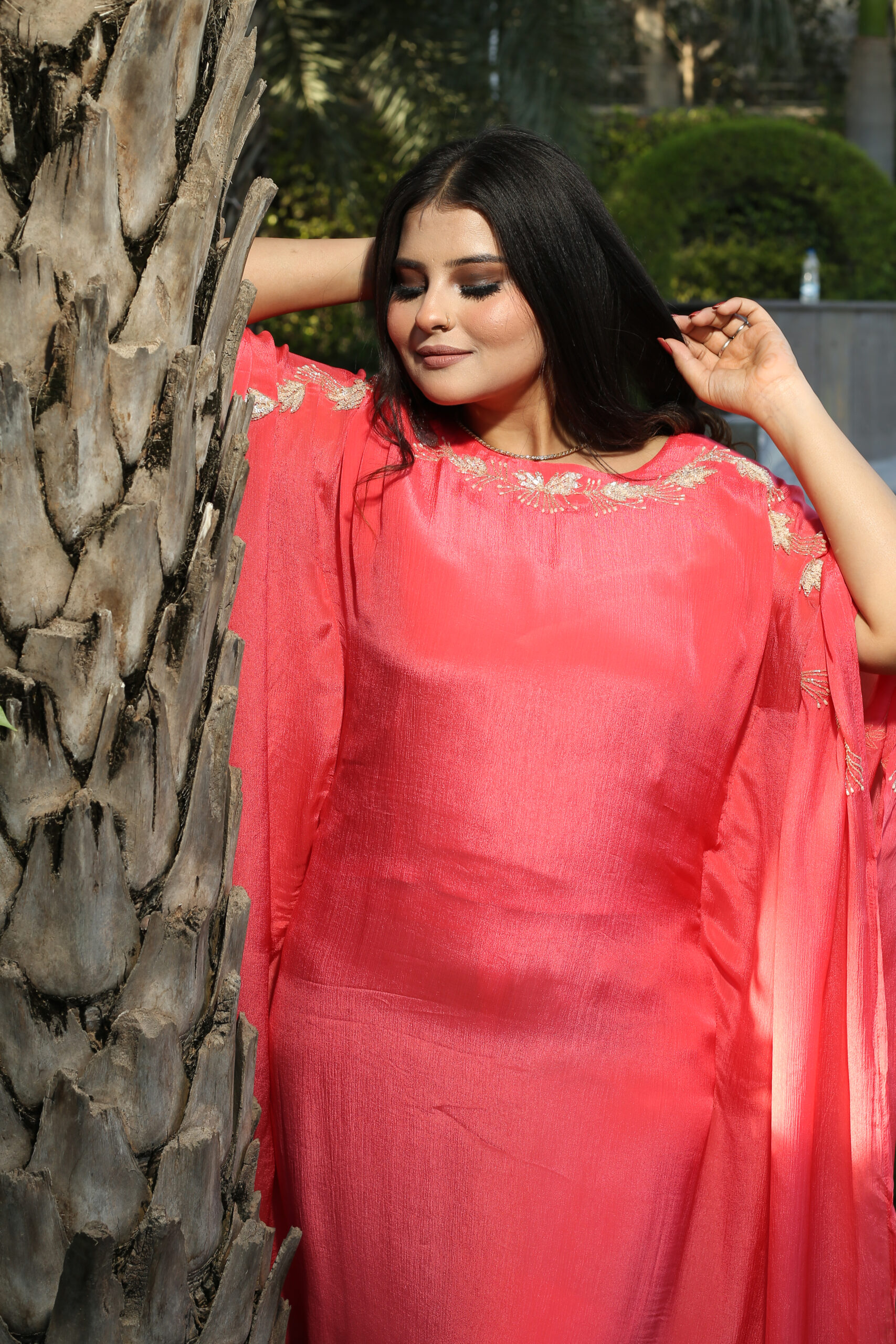 A Pure Chinnon kaftan suit with handwork on the neck is a graceful and elegant ensemble. The lightweight and flowy nature of Chinnon fabric, combined with the handwork detailing on the neck, adds a touch of sophistication. This type of kaftan suit is likely to provide comfort and style, making it suitable for various occasions with a hint of traditional charm.
