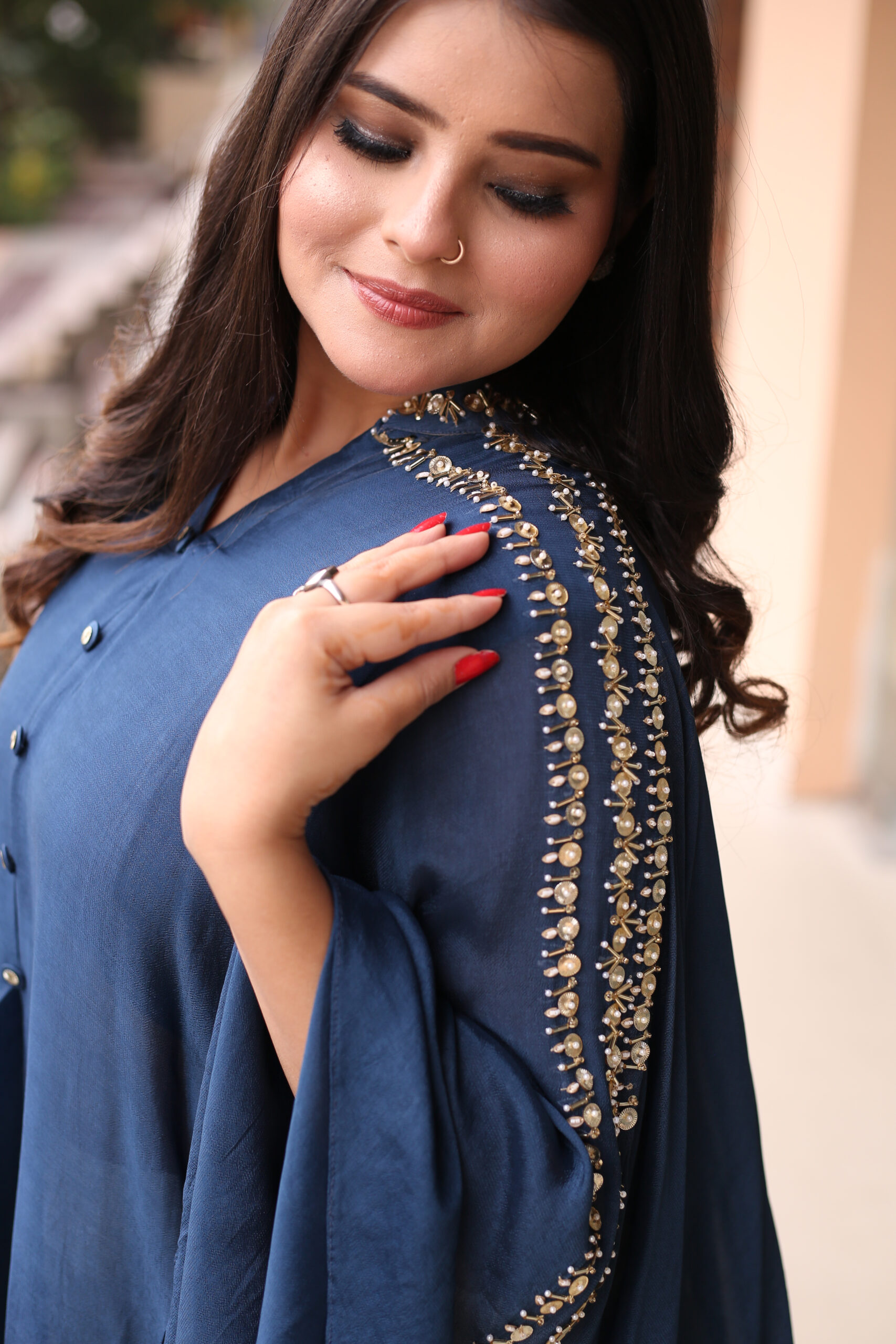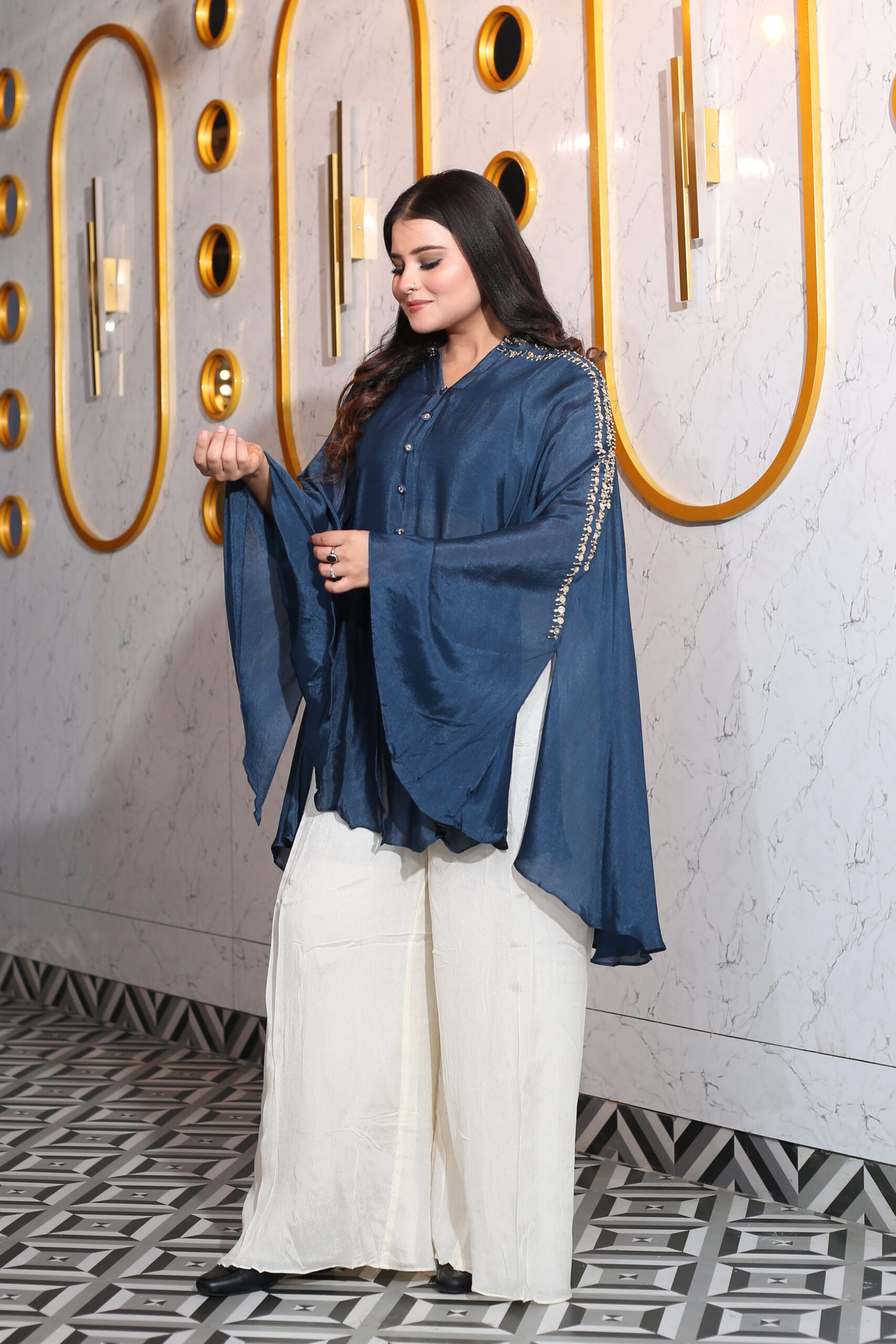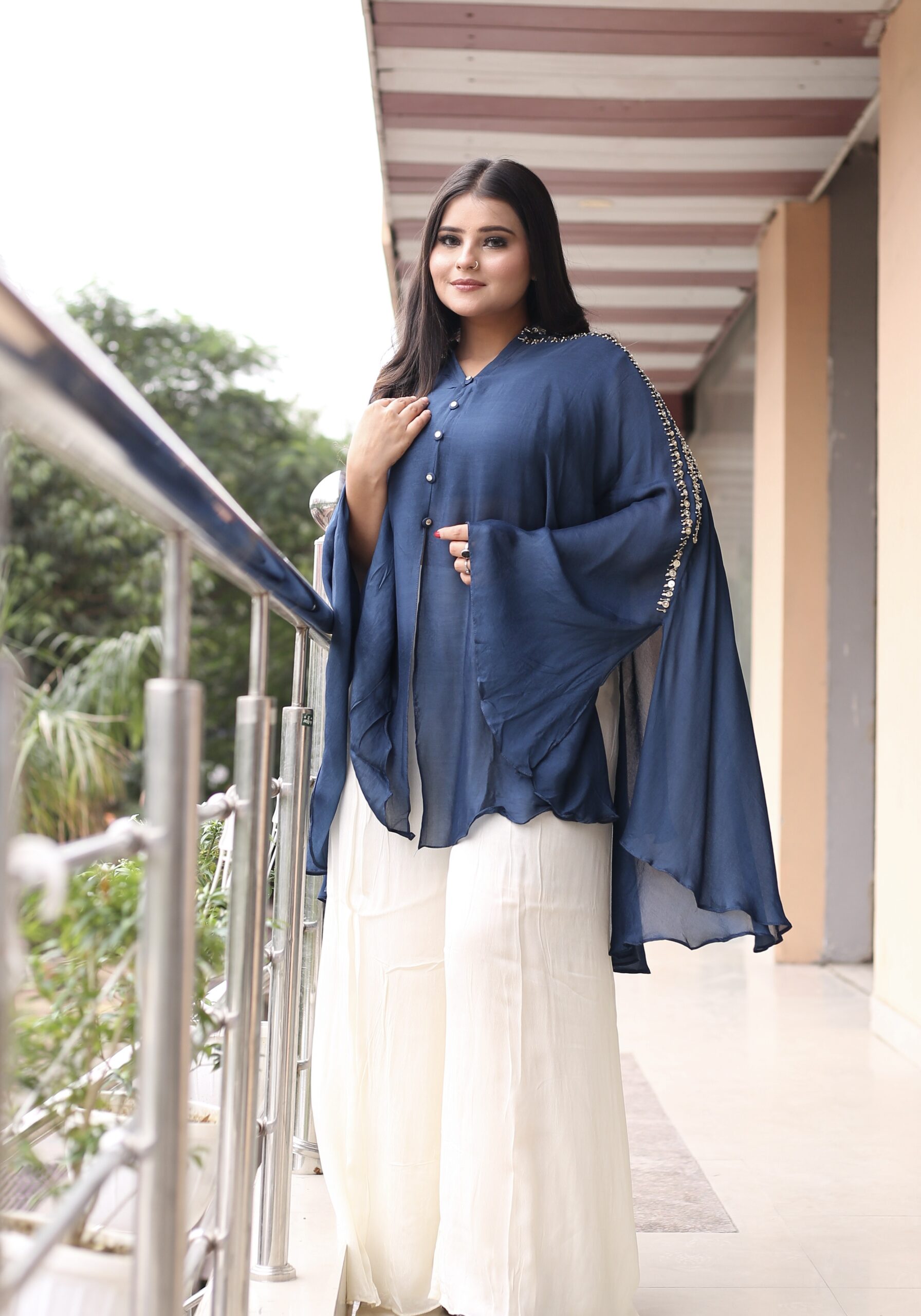 Step into elegance with our Pure Chinnon Coord Set in a captivating cape style, featuring exquisite embroidery on the shoulders. The lightweight and sheer Chinnon fabric add a touch of grace, while the cape-style silhouette brings a sense of sophistication to your ensemble. The intricate embroidery on the shoulders enhances the outfit with artistic detailing, making it a perfect choice for special occasions. Revel in the luxurious feel of pure Chinnon and the elevated design of a cape silhouette, harmonizing comfort and style effortlessly. Make a statement with our Pure Chinnon Coord Set, where every stitch reflects a commitment to refined fashion.