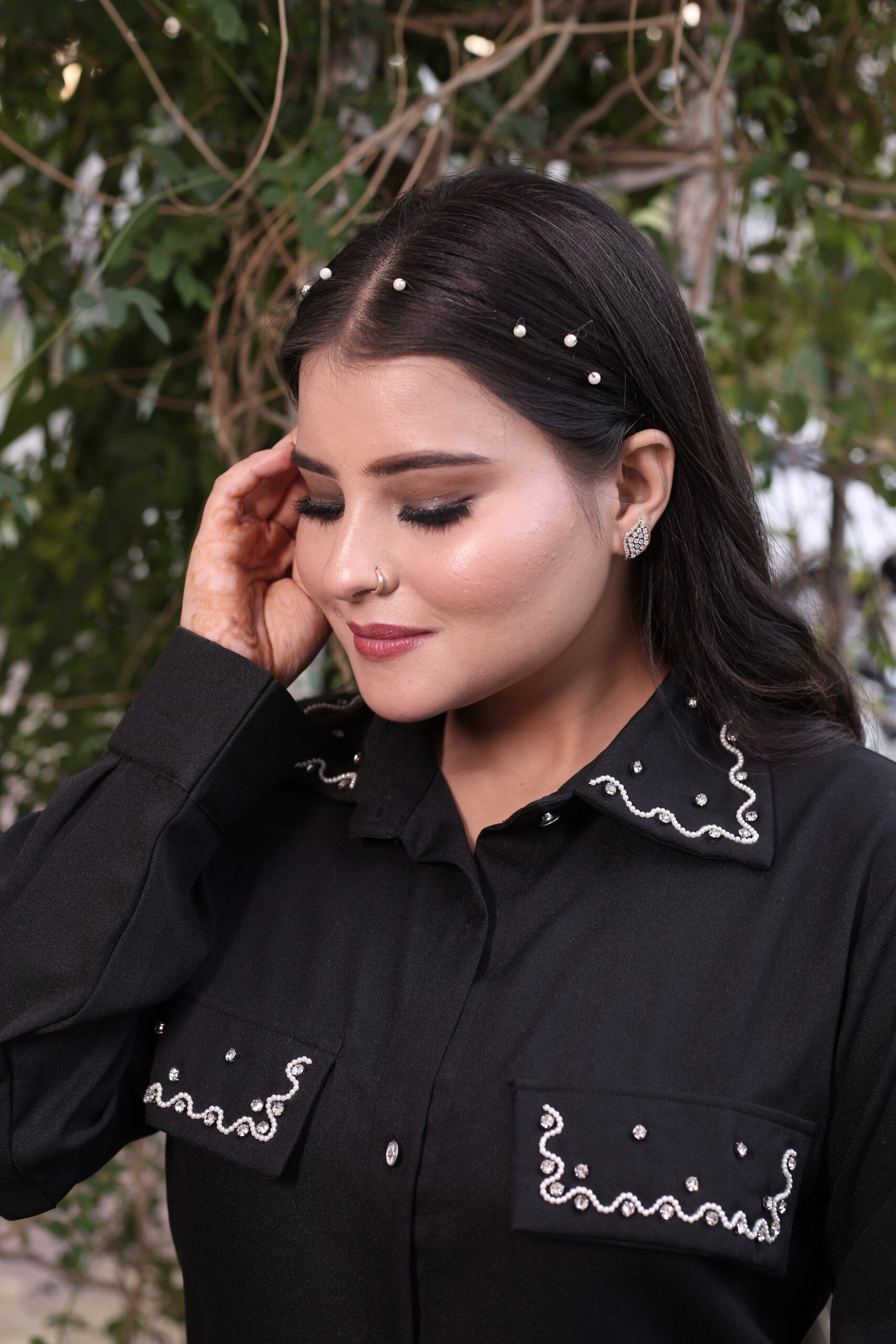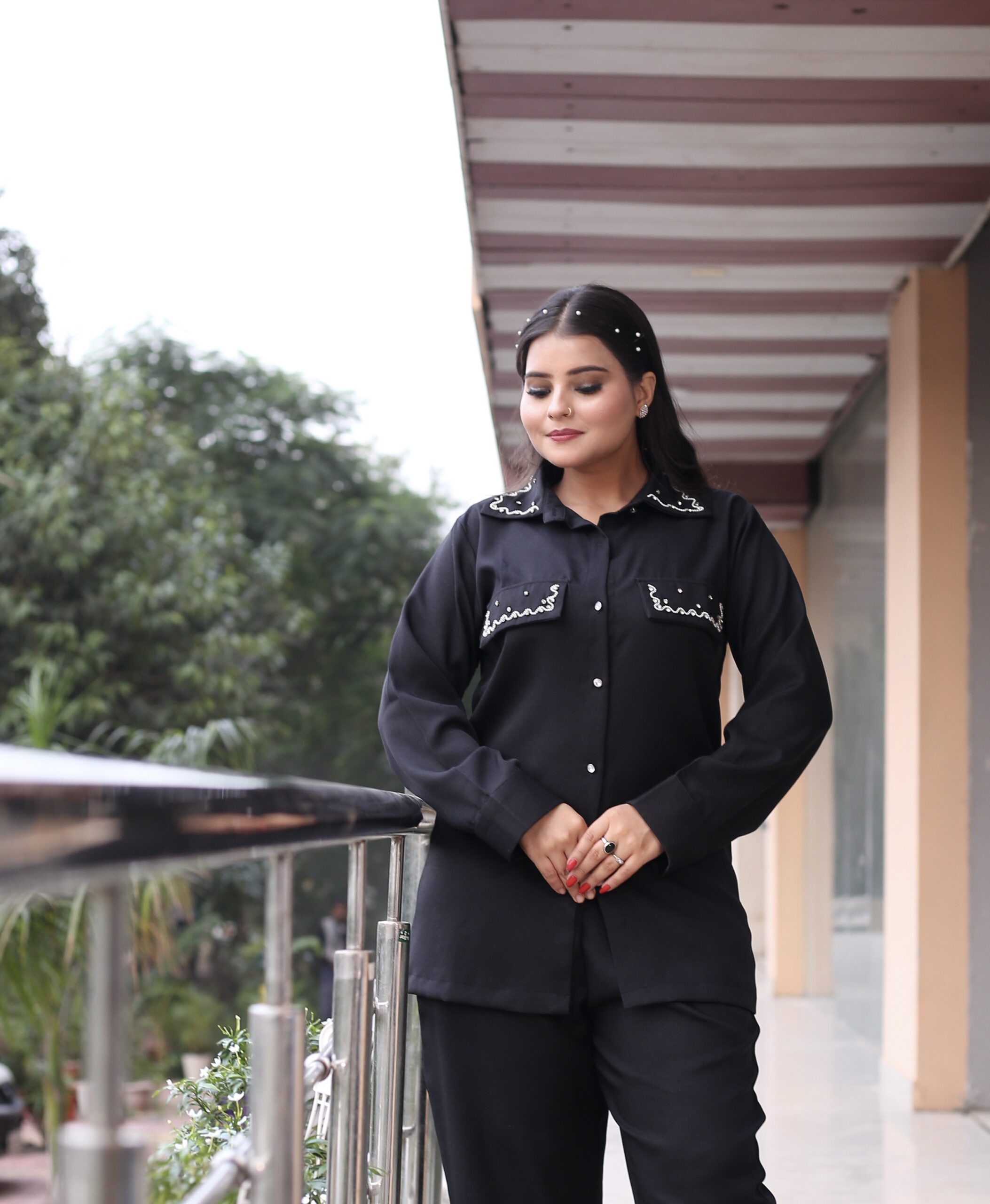 Step into chic elegance with our Black Banana Crepe Coord Set, featuring a contemporary double pocket style and exquisite collar neck embroidery on both the collar and pockets. The unique banana crepe fabric offers a luxurious feel with a hint of texture, while the double pocket design adds a modern touch. The detailed embroidery on the collar and pockets enhances the ensemble with a sophisticated flair. Perfect for a refined yet fashion-forward look, this coordinated set seamlessly combines comfort, style, and intricate detailing. Elevate your wardrobe with the timeless appeal of our Black Banana Crepe Coord Set, where every element speaks to a perfect fusion of fashion and craftsmanship.