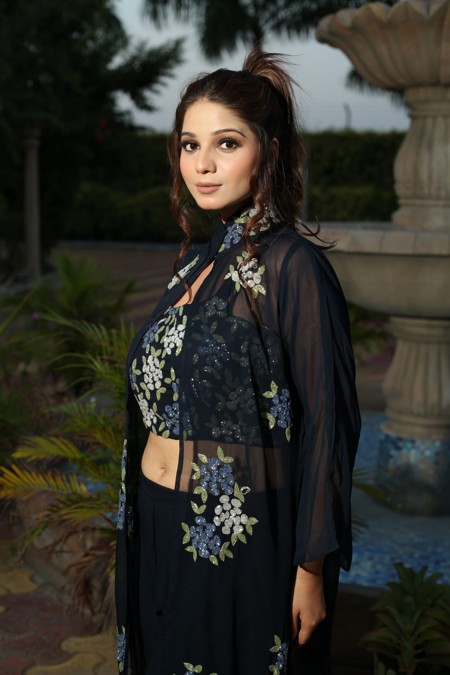 A three-piece coordinated set featuring a crop top, long shrug, and palazzo pants, all adorned with intricate embroidery. This ensemble promises a sophisticated and detailed look, ideal for special occasions or elevated casual wear.