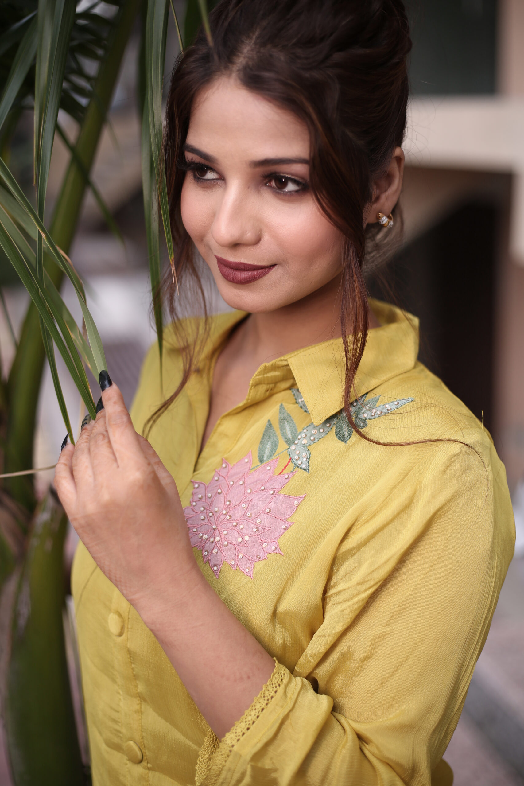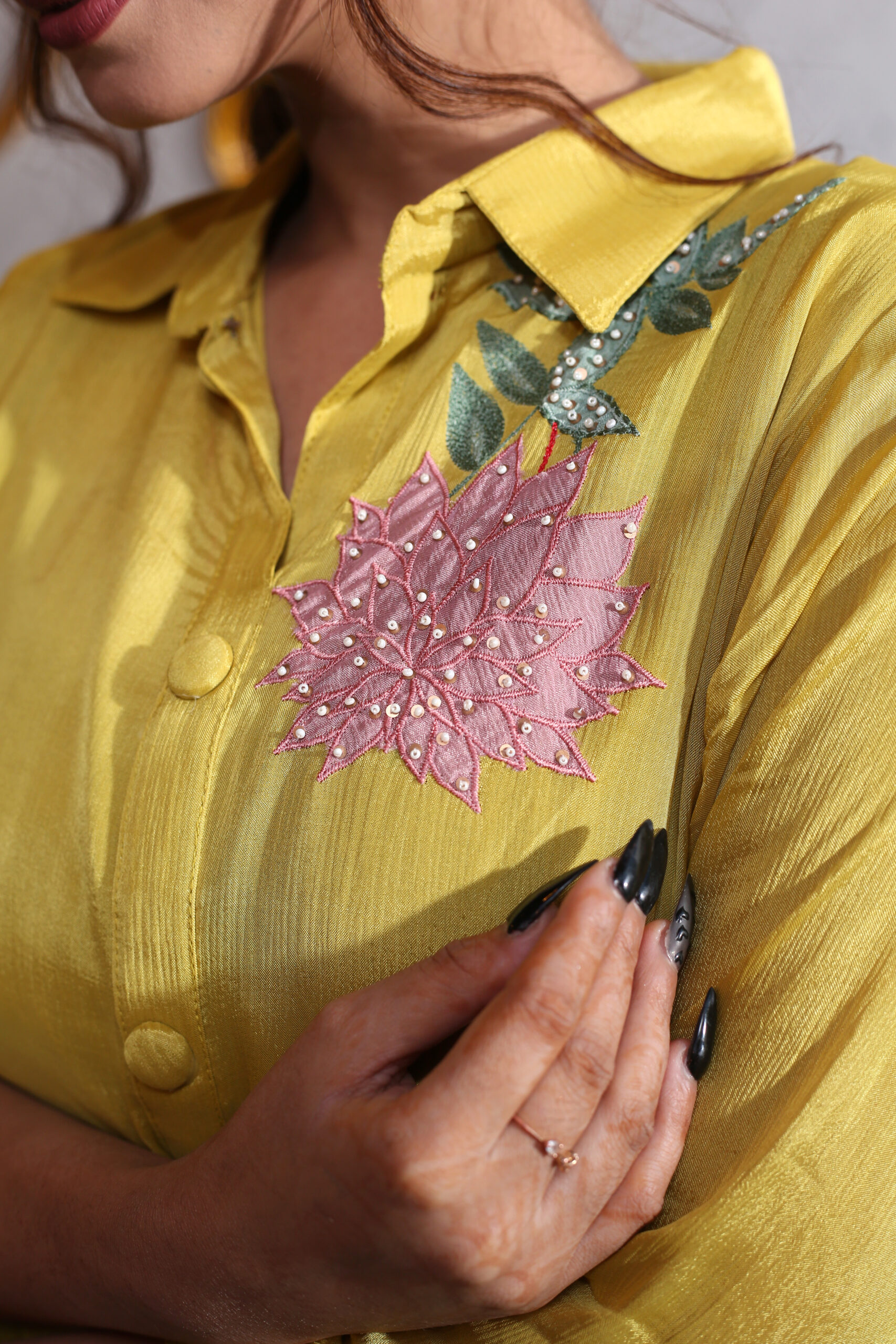 Radiate charm in our Yellow Pure Chinnon Coord Set, featuring an elegant collar neck and striking contrast pink color flower embroidery on the top. The lightweight and sheer Chinnon fabric add a touch of grace, while the collar neck design exudes sophistication. The vibrant pink flower embroidery creates a captivating visual contrast, making this ensemble perfect for special occasions. Immerse yourself in the blend of comfort and style, as the pure Chinnon fabric drapes effortlessly. Elevate your fashion statement with this Yellow Pure Chinnon Coord Set, where the meticulous embroidery adds a floral flourish to your refined look.