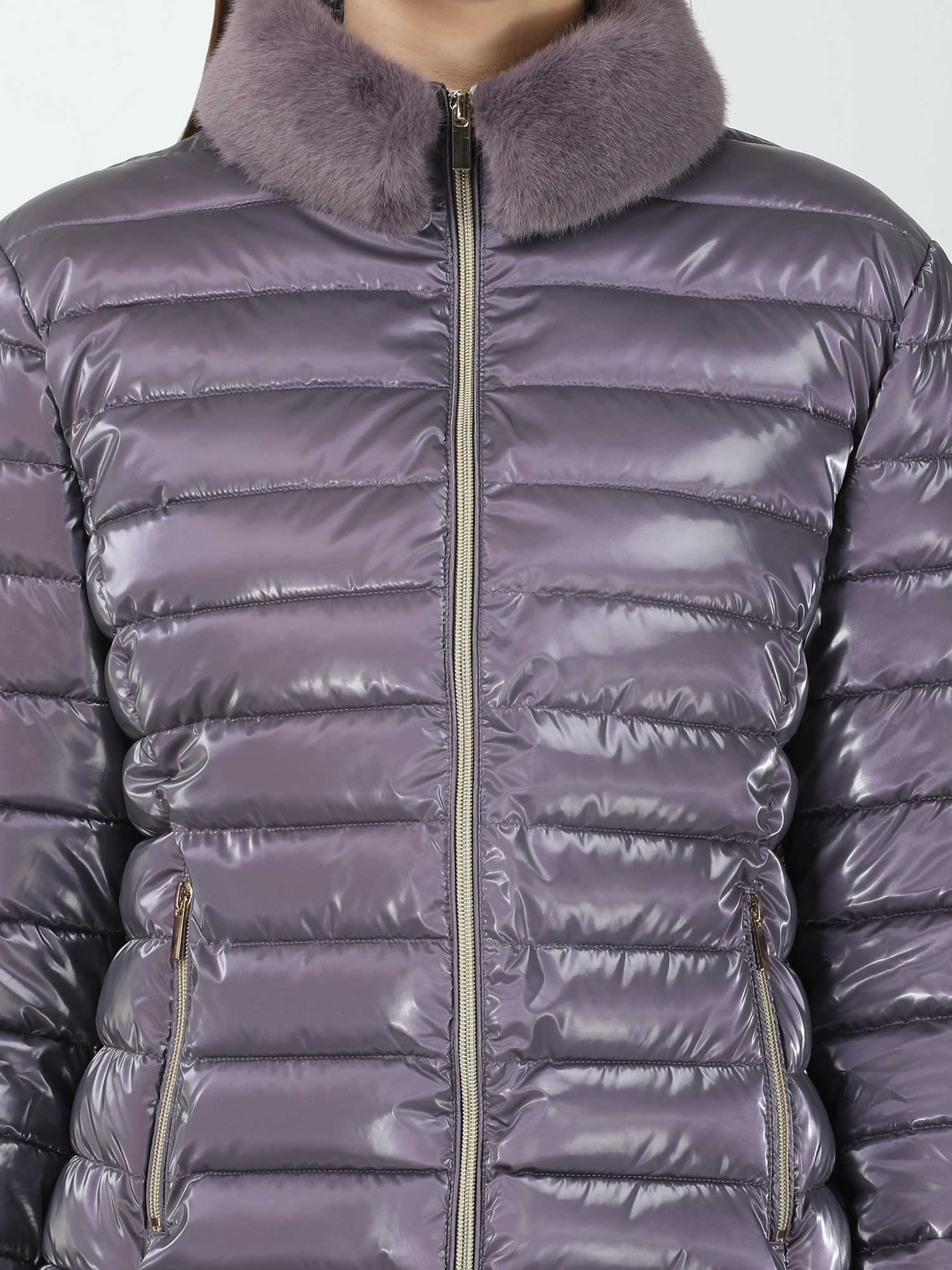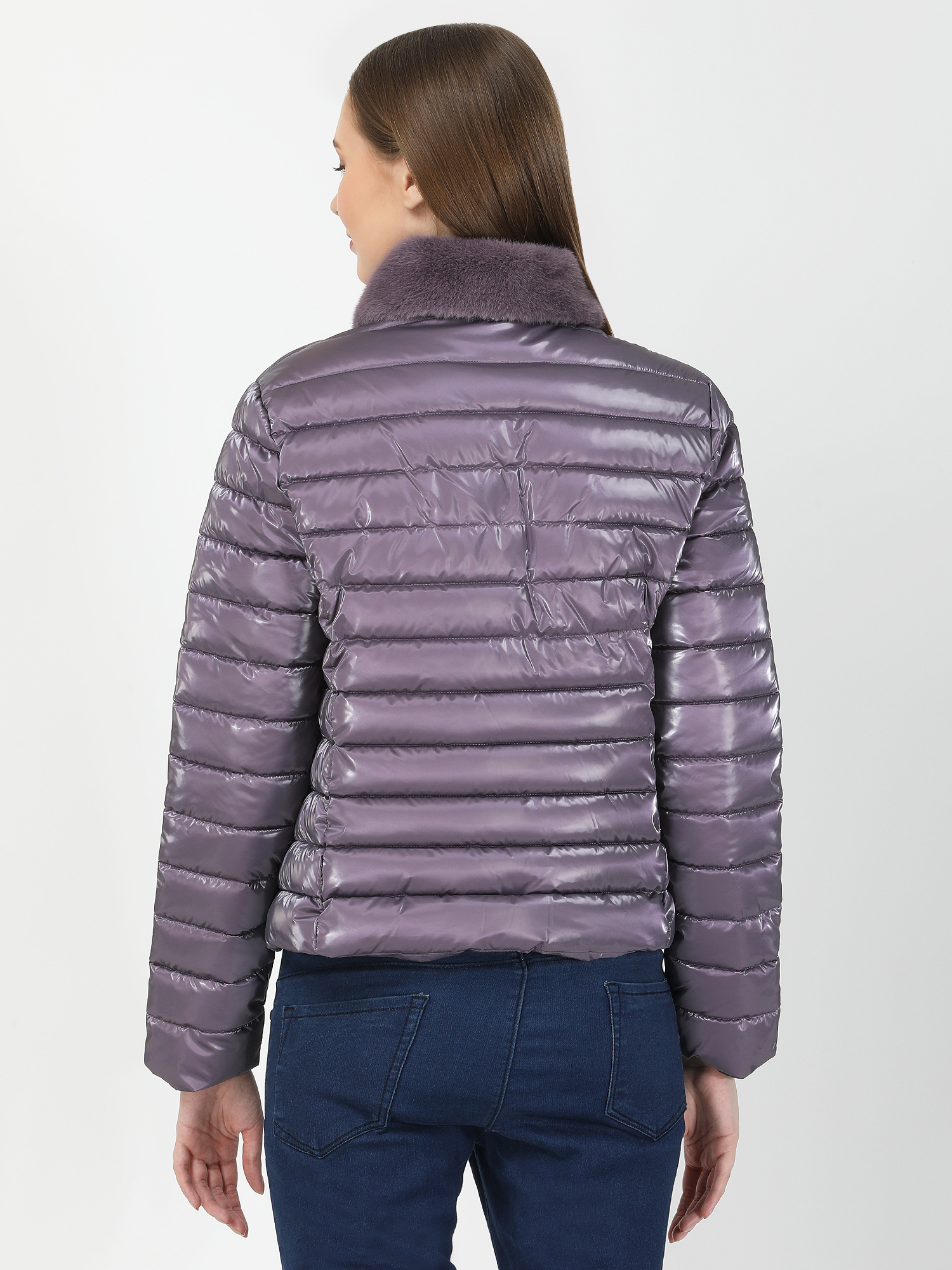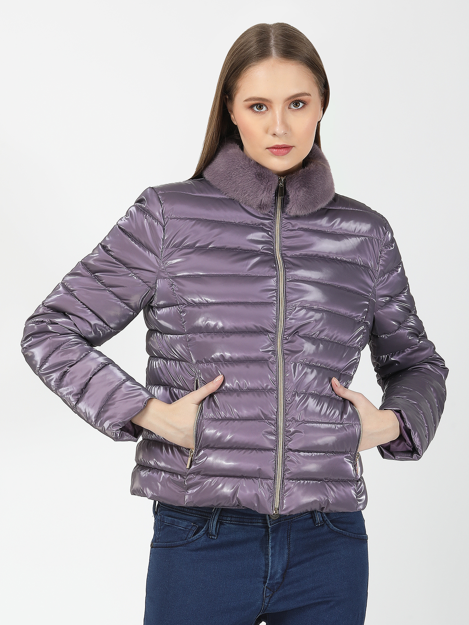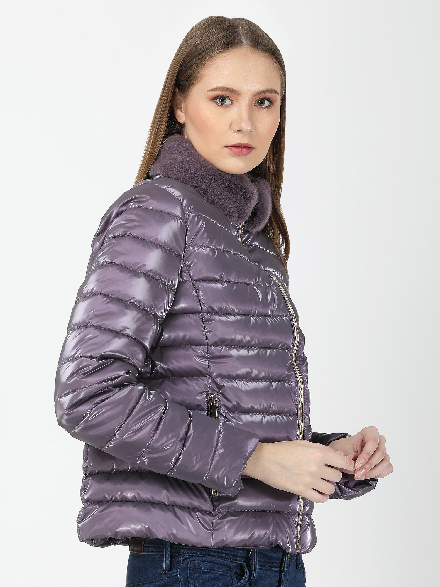 Make a bold statement with a shiny puff jacket adorned with a zipper and a detachable faux fur collar. This eye-catching design adds a touch of glamour to your winter wardrobe, providing both style and practicality for chilly days.