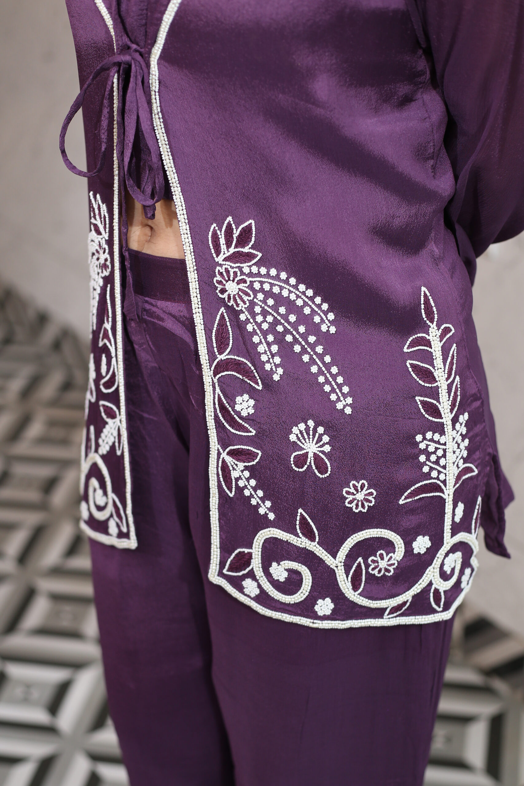 Step into sophistication with our Purple 3-Piece Cord Set featuring a crop top, bottom, and a stylish jacket adorned with elegant white embroidery. The crop top and bottom provide a contemporary silhouette, while the jacket adds a layer of refinement with its intricate embroidery. The purple hue adds a touch of regal charm to the ensemble. Elevate your look with this meticulously designed cord set, where the combination of pieces and delicate white embroidery on the jacket creates a coordinated outfit perfect for various occasions.